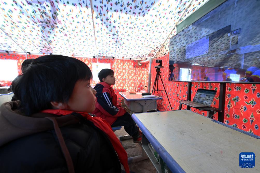 12月27日,在積石山縣柳溝鄉(xiāng)尕集春蕾小學(xué)臨時(shí)教學(xué)點(diǎn),學(xué)生通過(guò)直播課堂上課。