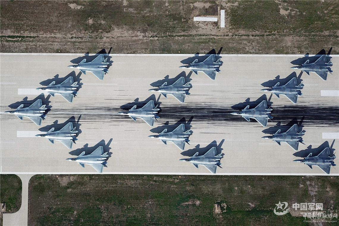 2021年6月20日,參加慶祝中國共產(chǎn)黨成立100周年飛行表演訓(xùn)練的15架殲-20飛機(jī)威武列陣。余紅春 攝