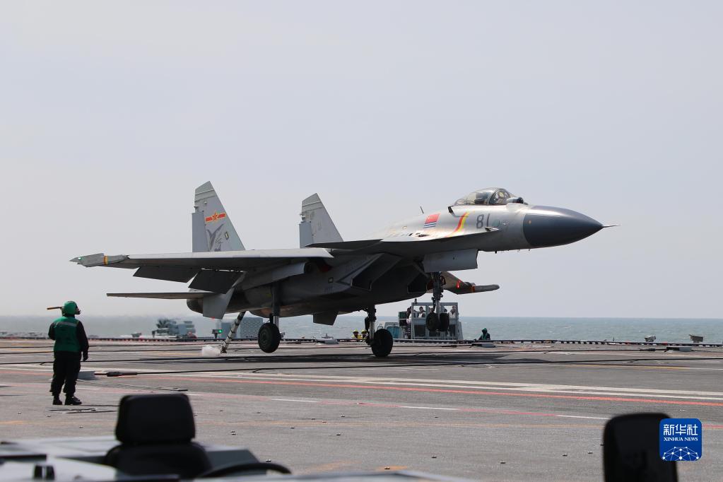海軍航空大學(xué)某基地飛行員駕駛殲-15戰(zhàn)機(jī)進(jìn)行觸艦復(fù)飛(2021年10月20日攝)。新華社發(fā)(姜濤 攝)
