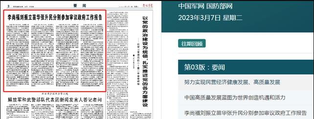 解放軍報3月7日報道,人代會期間,李尚福、劉振立、苗華、張升民四位中央軍委委員分別參加審議政府工作報告。