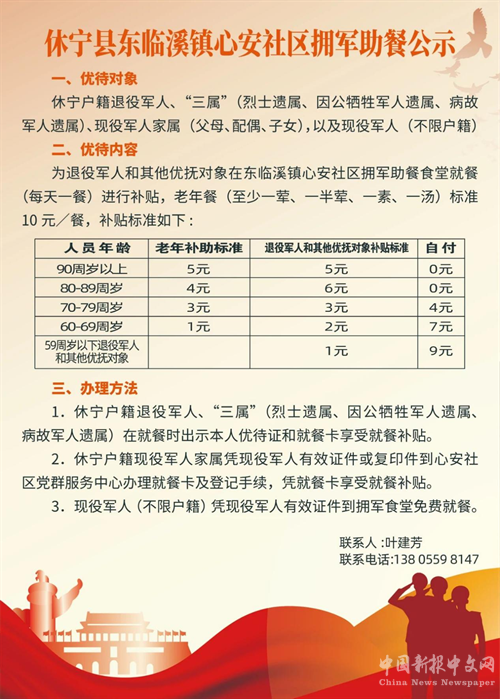 據(jù)悉,心安社區(qū)擁軍助餐食堂雖然建在社區(qū),但“擁軍食堂”面向全國所有現(xiàn)役軍人(含駐軍部隊(duì)官兵)以及休寧戶籍退役軍人、“三屬”(烈士遺屬、因公犧牲軍人遺屬、病故軍人遺屬)、現(xiàn)役軍人家屬(父母、配偶、子女)開放,并在此前社區(qū)老年就餐補(bǔ)助基礎(chǔ)上,額外為現(xiàn)役軍人、軍屬和退役軍人提供1至6元的提標(biāo)優(yōu)待,所有休寧籍80周歲以上的老兵和全國的現(xiàn)役軍人均可在此免費(fèi)就餐。