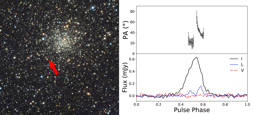 右:來自“中國天眼”觀測數(shù)據(jù)的M71E的平均脈沖輪廓和偏振位置角。(中科院國家天文臺供圖)