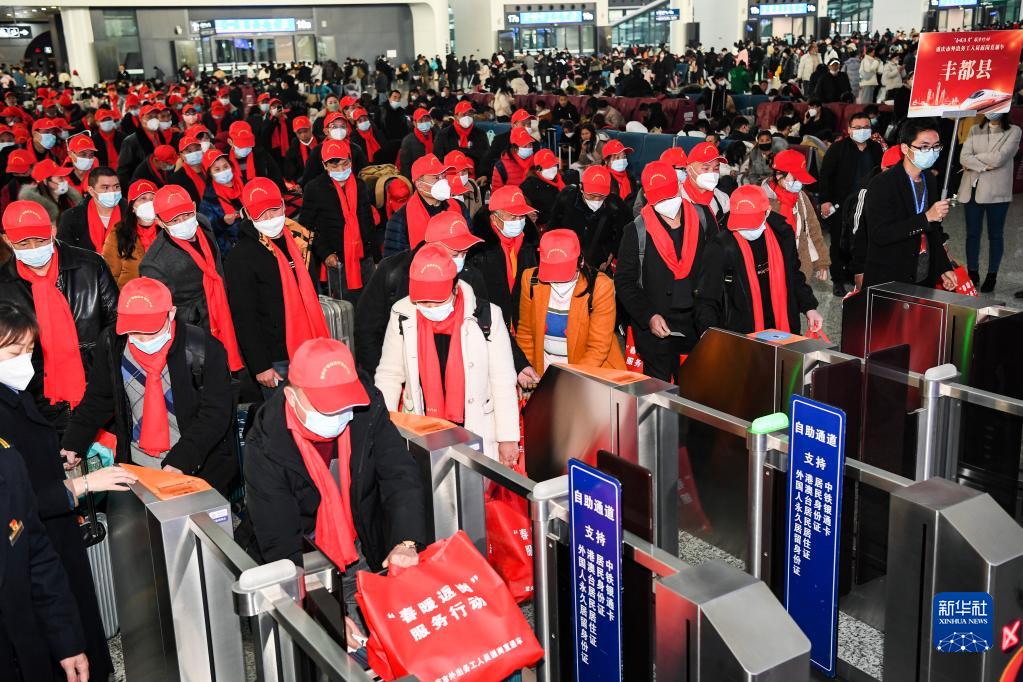 1月30日,在重慶西站,乘坐2023年重慶首趟務(wù)工定制專列的旅客自助檢票,前往站臺乘車。