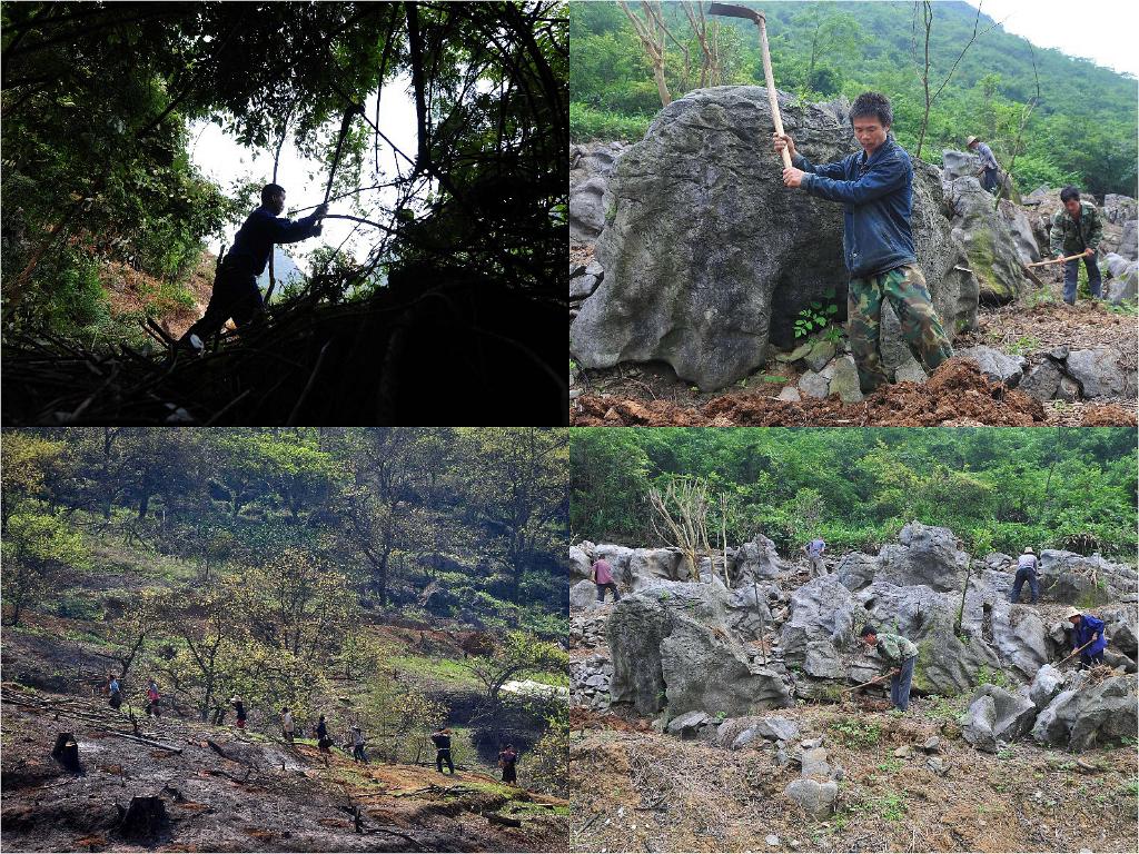 拼版照片:融安縣東起鄉(xiāng)銅板屯村民改造荒山。上左:銅板屯村民龍飛聯(lián)在山上砍雜草(2013年7月23日新華社記者黃孝邦攝);上右:銅板屯村民龍革雄在開墾荒地準(zhǔn)備種植李子樹苗(2013年5月15日新華社記者黃孝邦攝);下左:銅板屯村民們上山開荒(2013年3月5日新華社記者黃孝邦攝);下右:銅板屯村民們?cè)诜N樹(2013年5月15日新華社記者張愛林?jǐn)z)。