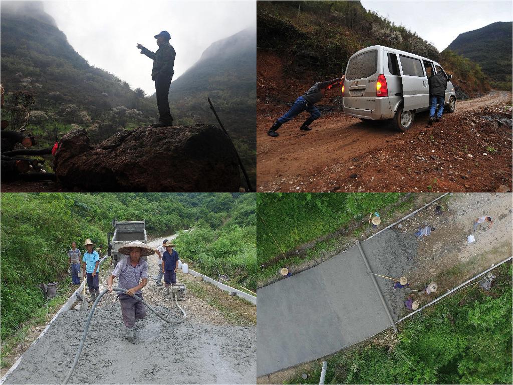 拼版照片:2014年和2015年融安縣東起鄉(xiāng)銅板屯村民修建進(jìn)屯道路的場(chǎng)景。上左:一名銅板屯村民在查看地形,準(zhǔn)備硬化進(jìn)屯路(2014年2月18日新華社記者張愛林?jǐn)z);上右:銅板屯村民推著車輛經(jīng)過濕滑路段進(jìn)入銅板屯(2014年2月18日新華社記者黃孝邦攝);下左:銅板屯村民們?cè)谛蘼罚?015年4月21日新華社記者黃孝邦攝);下右:銅板屯村民們?cè)谛蘼罚?015年4月21日新華社記者黃孝邦攝)。