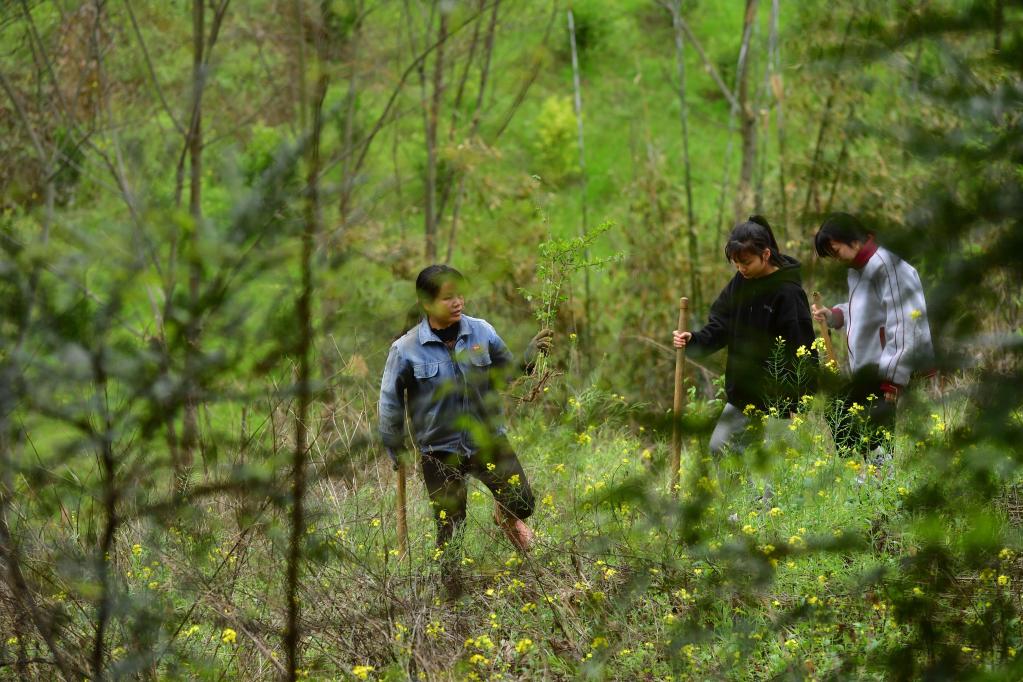 銅板屯村民羅桂枝(左一)帶著兩個(gè)女兒在山上種植李樹(2021年3月7日攝)。