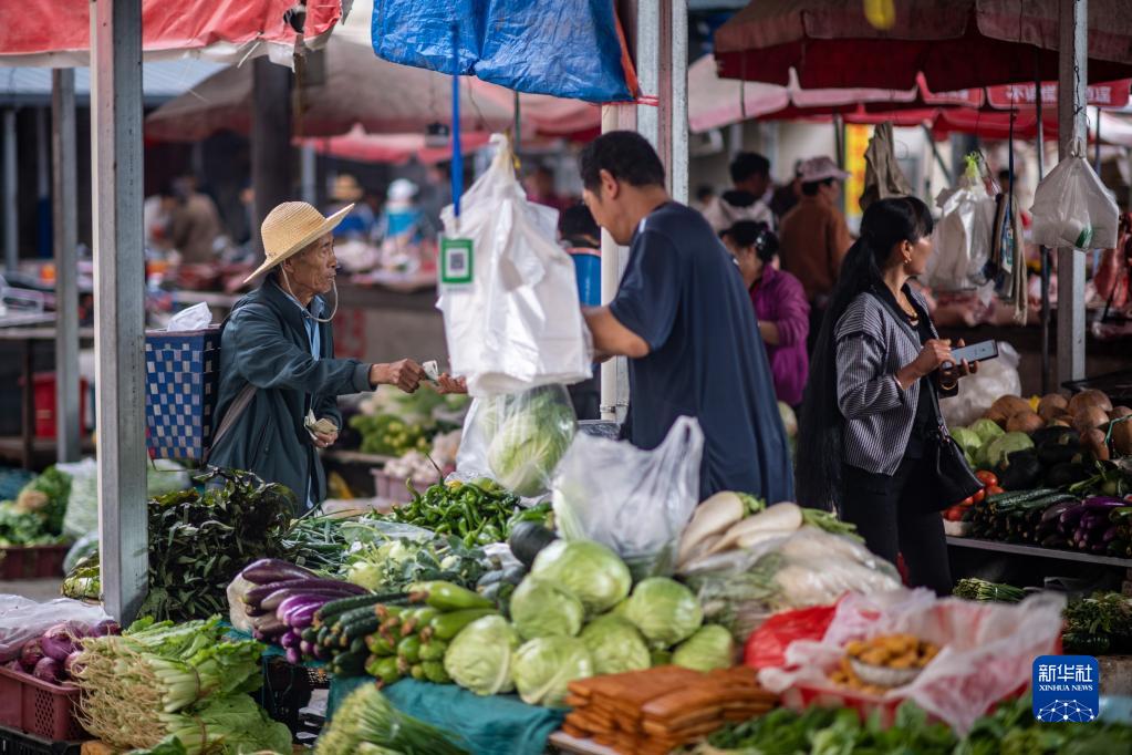 5月3日,村民在云南省保山市隆陽(yáng)區(qū)瓦窯鎮(zhèn)集貿(mào)市場(chǎng)購(gòu)買(mǎi)新鮮蔬菜。
