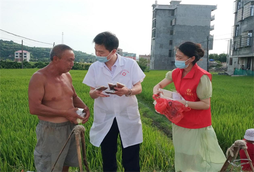 陳建軍(中)深入田間地頭宣傳防暑知識(shí),并為群眾免費(fèi)送去防暑藥品。