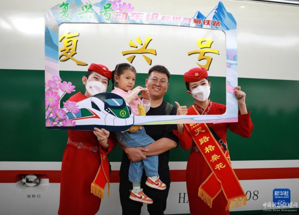 7月1日,乘客與乘務(wù)人員在西寧至格爾木動(dòng)車組首發(fā)列車前合影留念。