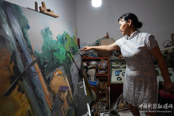 在大港頭村,雷春英是村里最有人氣的農(nóng)民畫家。在河邊隨手撿拾的鵝卵石,在她的筆下變成了一只只可愛的瓢蟲。雷春英原本是當(dāng)?shù)啬静膹S的工人。“村里有很多畫家來寫生,我就在一旁觀摩學(xué)習(xí)。”雷春英說,村里的埠頭、白帆、古樟樹、亭榭都成為她筆下的創(chuàng)作素材。如今,她的畫一幅能賣幾百塊,網(wǎng)絡(luò)訂單紛紛而至。在十平方米的書畫創(chuàng)作室里, 雷春英調(diào)色、蘸墨、下筆, 畫筆勾勒出的是家鄉(xiāng)的美景與她的美麗生活。