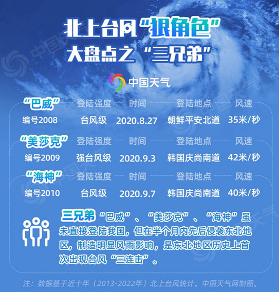 臺(tái)風(fēng)“卡努”一路蜿蜒,10日起,它將先登陸朝鮮半島,再影響我國(guó)東北地區(qū),這樣的路徑有些似曾相識(shí)。中國(guó)天氣網(wǎng)盤(pán)點(diǎn)臺(tái)風(fēng)大數(shù)據(jù)發(fā)現(xiàn),在近十年北上影響的臺(tái)風(fēng)中,有三個(gè)臺(tái)風(fēng)的路徑以及影響范圍和“卡努”十分相像,它們便是2020年的第8號(hào)臺(tái)風(fēng)“巴威”、第9號(hào)臺(tái)風(fēng)“美莎克”、第10號(hào)臺(tái)風(fēng)“海神”。