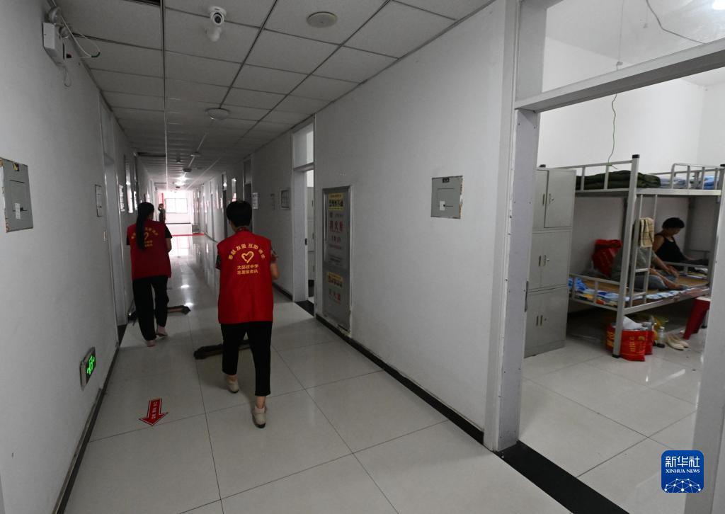 8月12日,在天津市靜海區(qū)大邱莊中學(xué)集中安置點(diǎn),志愿者在打掃樓道衛(wèi)生。