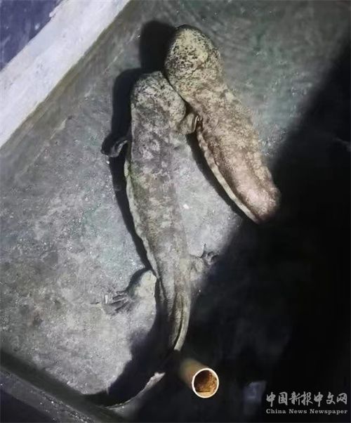 大鯢,俗稱娃娃魚。百度的解說,這是有尾目隱鰓鯢科大鯢屬,現(xiàn)存最大的兩棲動(dòng)物。其頭大而寬扁,軀干較扁平,尾略短;眼小位于頭背面,無眼瞼;口裂寬大,腹位;吻端微上翹;皮膚光滑,皮膚腺發(fā)達(dá);通身背面棕黑色,少數(shù)個(gè)體為黑黃色或棕灰色,常有不規(guī)則的大黑斑;腹面紅棕色,或淺灰色。其俗稱“娃娃魚”,因鳴聲似小孩啼哭故名。