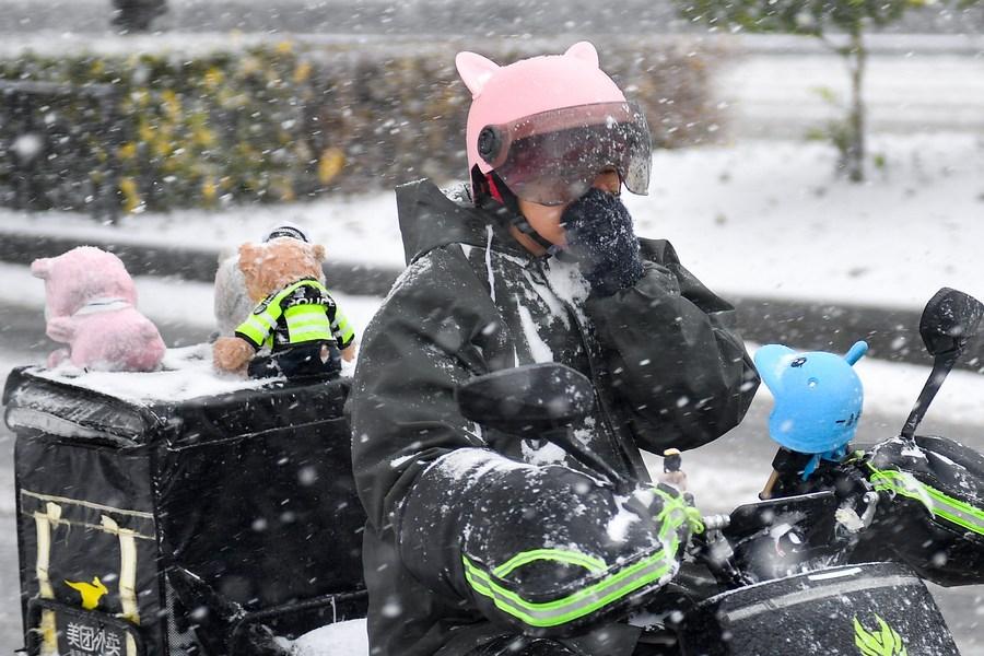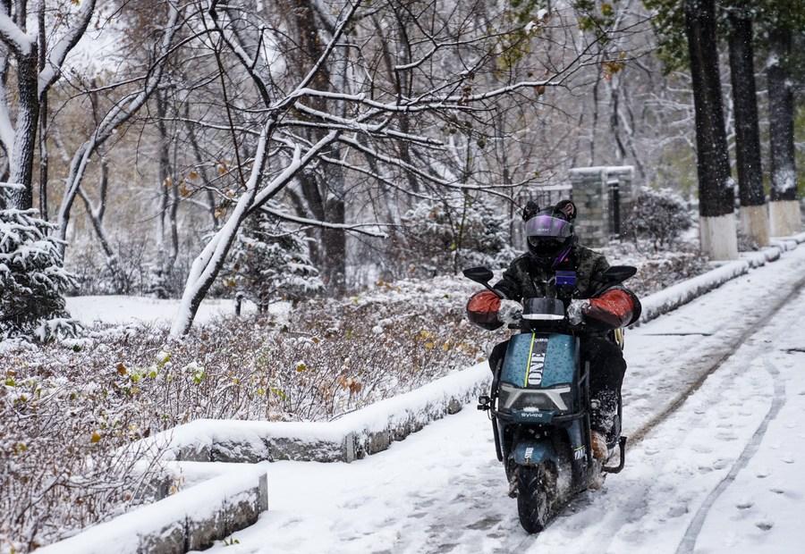 11月6日,在長春市街頭,一名外賣員在雪中騎行。新華社記者 許暢 攝