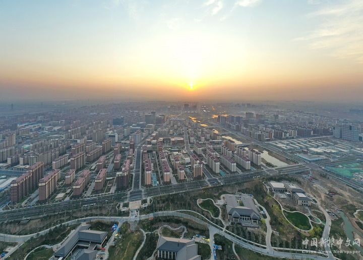 這是在雄安新區(qū)容東片區(qū)拍攝的日出(2023年3月31日攝,無人機(jī)照片)。新華社記者 牟宇 攝
