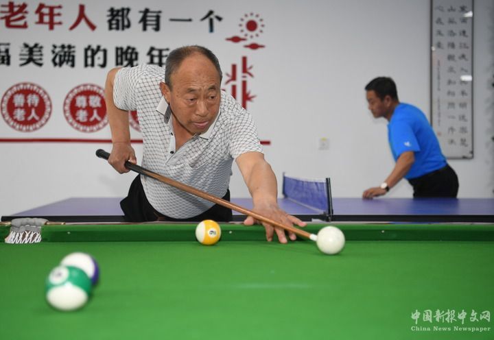 老年人在雄安新區(qū)容西第一養(yǎng)老驛站打臺(tái)球(2023年4月10日攝)。新華社記者 朱旭東 攝