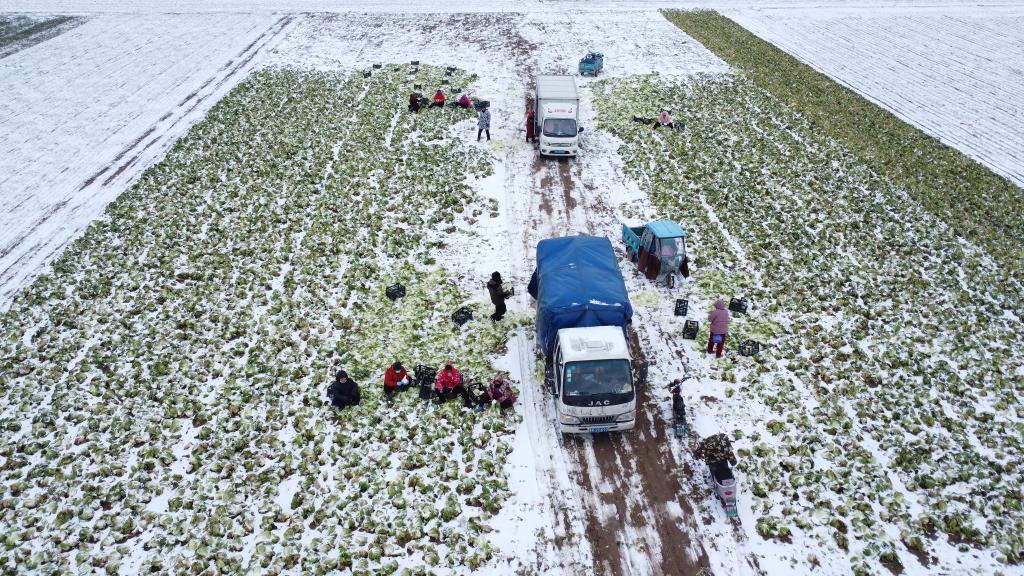 12月12日,河南扶溝縣呂潭鄉(xiāng)吉唐莊村的村民正在雪中采摘蔬菜。(扶溝縣委宣傳部供圖)