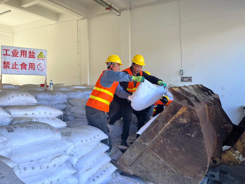 在貴州威寧縣,有關(guān)部門為應(yīng)對(duì)寒潮正在裝車轉(zhuǎn)運(yùn)工業(yè)用鹽。(威寧縣融媒體中心供圖)