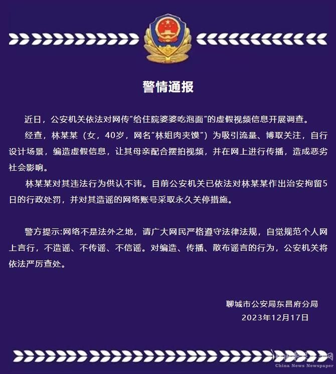 中國網(wǎng)12月18日訊 記者從聊城市公安局東昌府分局了解到,近日,公安機關(guān)依法對網(wǎng)傳“給住院婆婆吃泡面”的虛假視頻信息開展調(diào)查。經(jīng)查,林某某(女,40歲,網(wǎng)名“林姐肉夾饃”)為吸引流量、博取關(guān)注,自行設(shè)計場景,編造虛假信息,讓其母親配合擺拍視頻,并在網(wǎng)上進行傳播,造成惡劣社會影響。