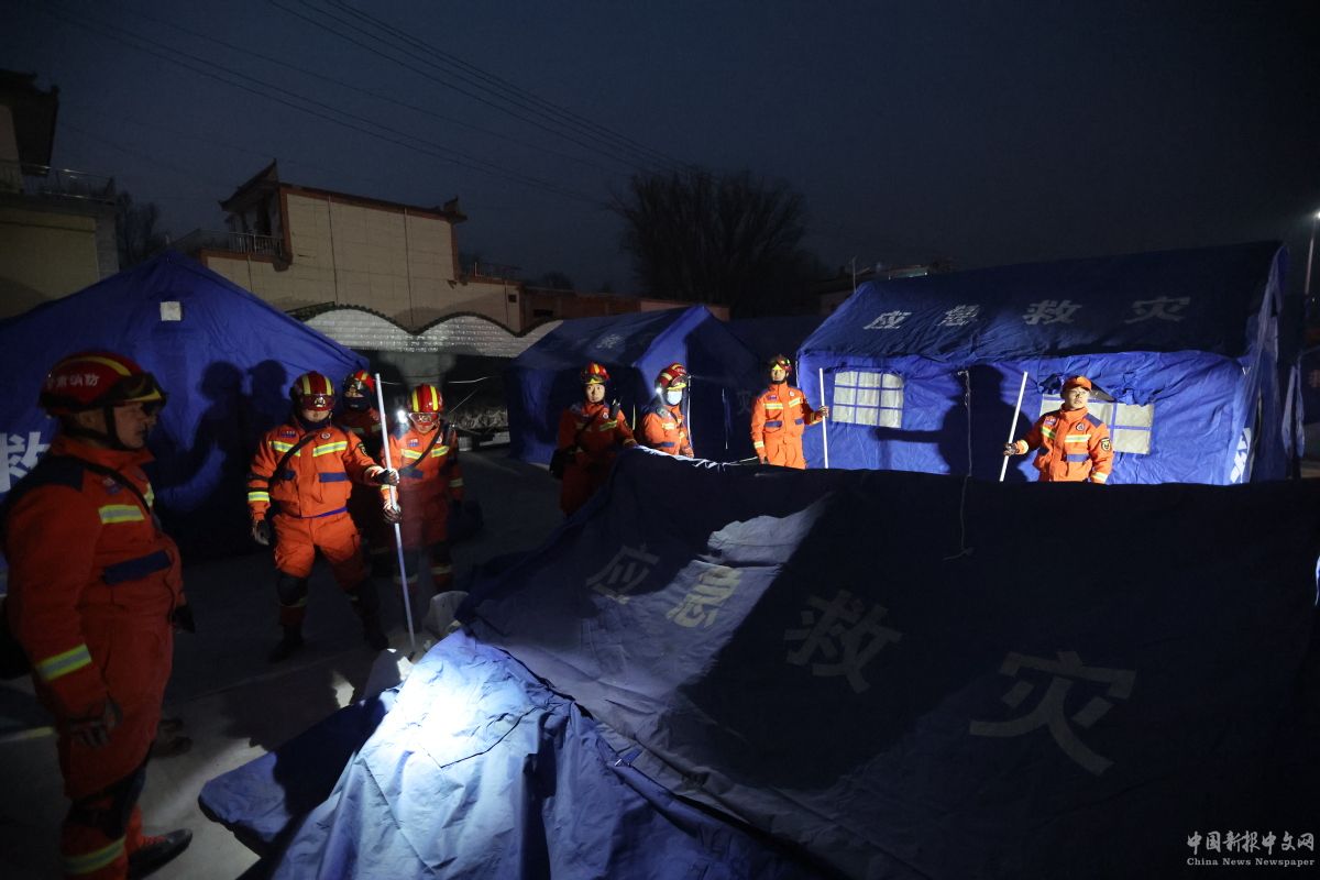 12月19日,甘肅臨夏州積石山縣大河家鎮(zhèn)康吊村,消防救援人員搭建應(yīng)急救災(zāi)帳篷。田蹊 攝
