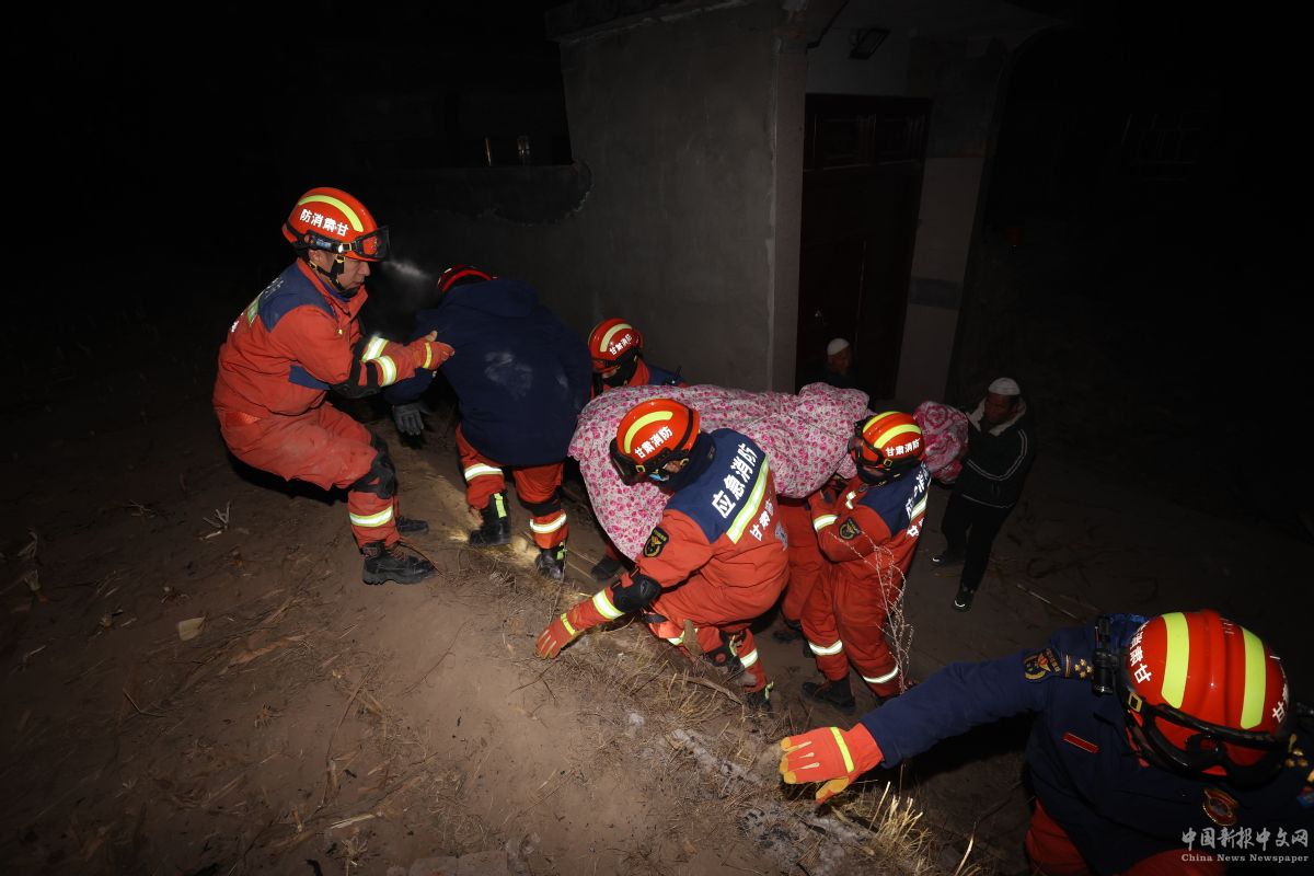 12月19日,甘肅臨夏州積石山縣大河家鎮(zhèn)康吊村,消防救援人員救助被困村民。田蹊 攝