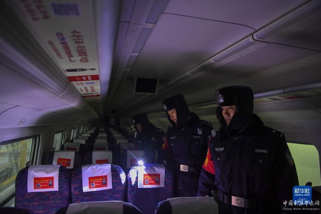 12月19日,在長(zhǎng)春動(dòng)車(chē)所,民警張?zhí)忑垼ㄓ遥?、趙軍哥(中)和王占東在列車(chē)上巡查。
