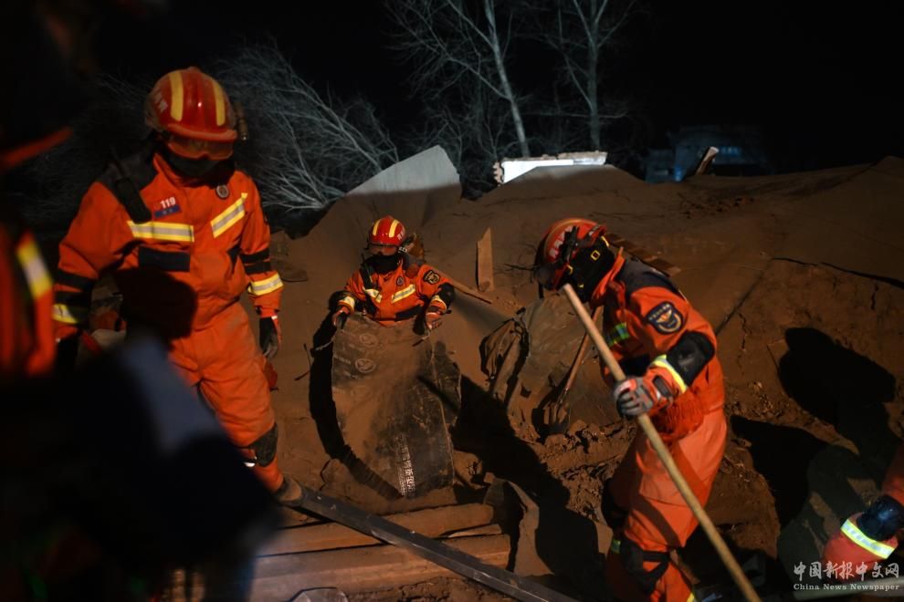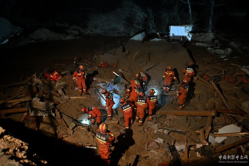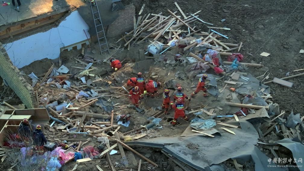 12月19日凌晨,在青海省海東市民和回族土族自治縣中川鄉(xiāng)草灘村,海東市消防救援支隊隊員在搜救。