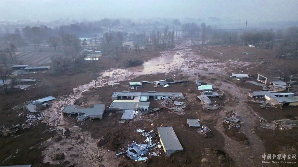 源源不斷的消防應(yīng)急車輛跟我們駛向相同的方向。接近凌晨5點30,我們抵達(dá)中川鄉(xiāng)草灘村,村道已被淤泥阻斷,海東市消防救援支隊的隊員正在被泥沙沖毀的院落內(nèi)開展救援,現(xiàn)場溫度接近零下20度,架在墻上的梯子摸上去跟冰一樣,我和同事相互扶著梯子,爬上了房頂。
