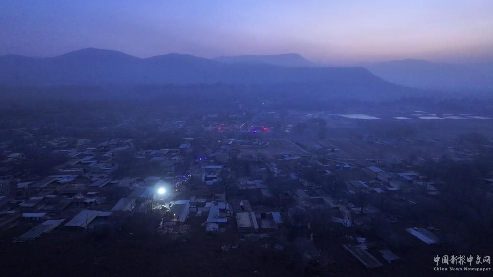 12月19日拍攝的青海省海東市民和回族土族自治縣中川鄉(xiāng)草灘村一角,海東市消防救援支隊隊員架起探照燈正在開展救援(無人機(jī)照片)。