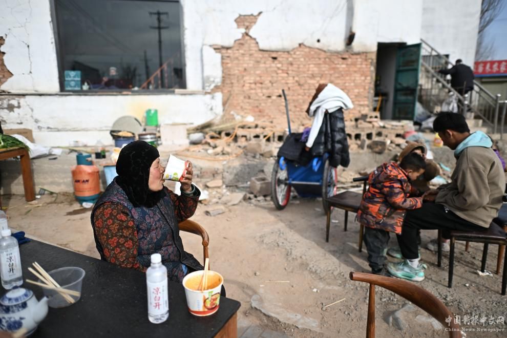 12月20日一早,馬俊海和家人購買了20袋面粉,在受損的店鋪前支起鍋灶,為鄉(xiāng)親們免費做拉面。小小的拉面攤,人手也越來越多,鄰居和親戚們也過來一起幫忙,和面、拉面、調(diào)湯、盛面……一碗又一碗熱氣騰騰的拉面送到了鄉(xiāng)親們的手中,驅(qū)走冬日的嚴(yán)寒。