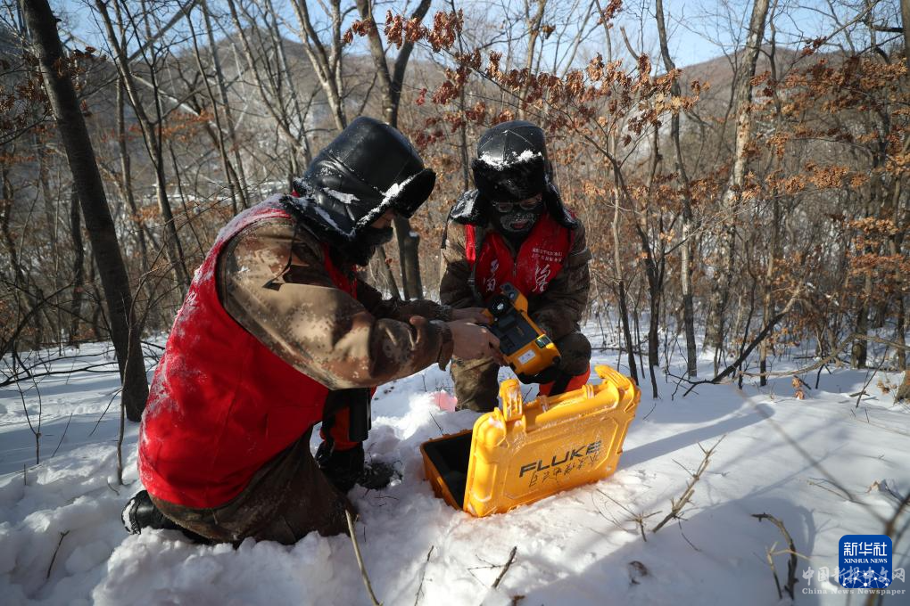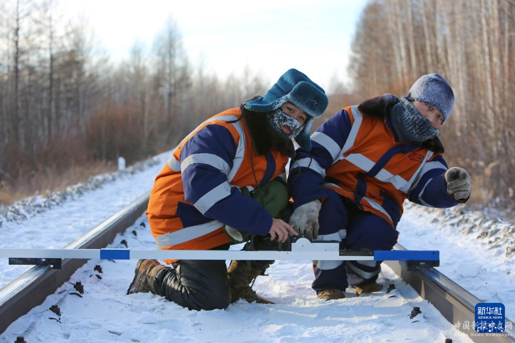 12月20日,在中國(guó)鐵路哈爾濱局加格達(dá)奇工務(wù)段,漠河車間職工在現(xiàn)場(chǎng)測(cè)量,確認(rèn)鐵路軌道凍脹情況。新華社圖片
