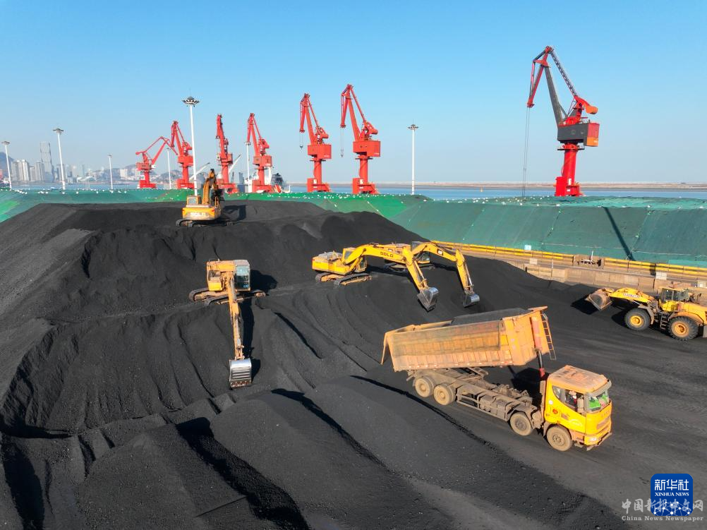 12月23日,在江蘇連云港港煤炭碼頭,大型機(jī)械在堆放儲(chǔ)存剛從貨輪卸運(yùn)的電煤(無(wú)人機(jī)照片)。新華社圖片
