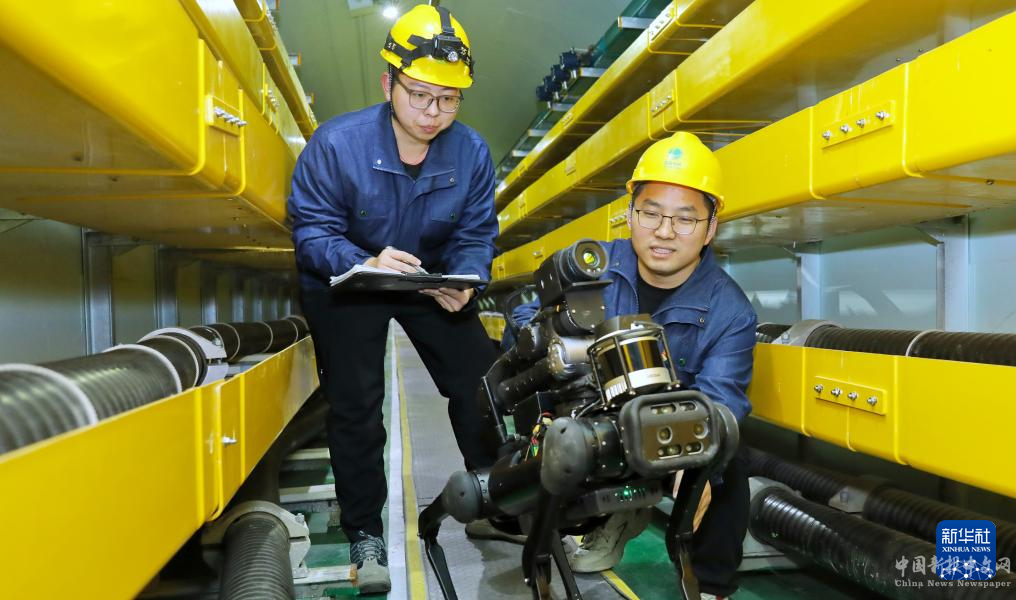 12月23日,國(guó)網(wǎng)北京電力公司技術(shù)人員調(diào)試“機(jī)器狗”四足巡檢機(jī)器人,準(zhǔn)備在北京市豐臺(tái)區(qū)玉泉營(yíng)電纜隧道內(nèi)開展寒潮天氣地下輸電線路巡檢。新華社圖片