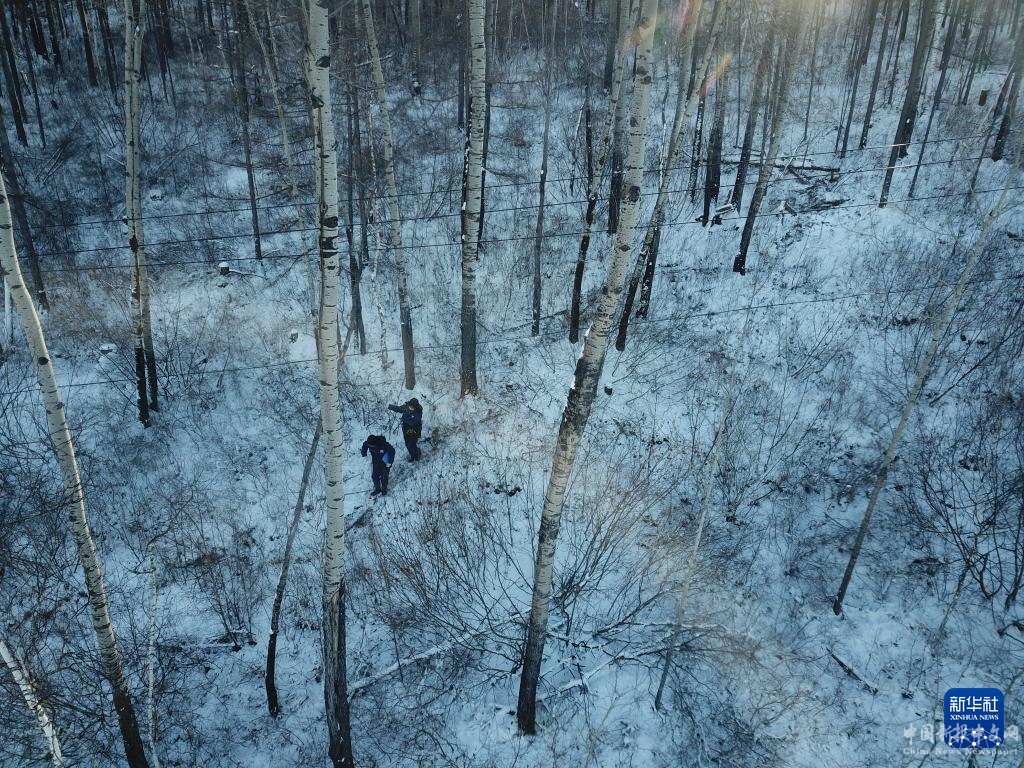 12月23日,在黑龍江省漠河市,電力線路設(shè)備運(yùn)維人員在北極村附近的山林中巡線(無(wú)人機(jī)照片)。新華社圖片