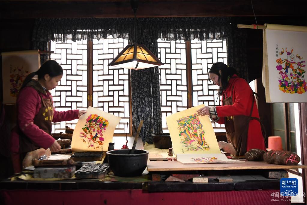 春節(jié)臨近,湖南省邵陽市隆回縣灘頭鎮(zhèn)的木版年畫作坊加班加點(diǎn)趕制年畫,供應(yīng)春節(jié)市場(chǎng)。