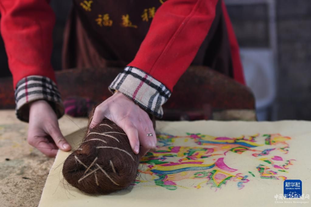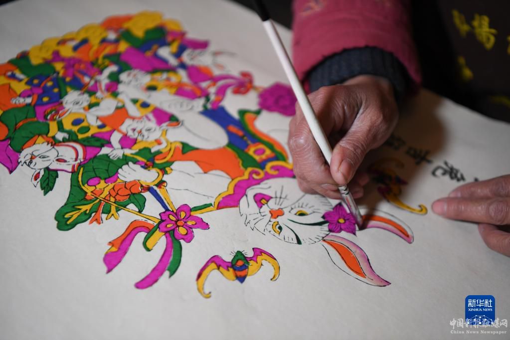 1月17日,在灘頭鎮(zhèn)福美祥年畫作坊,年畫藝人尹冬香在年畫上加入手繪使年畫更加靈動(dòng)。