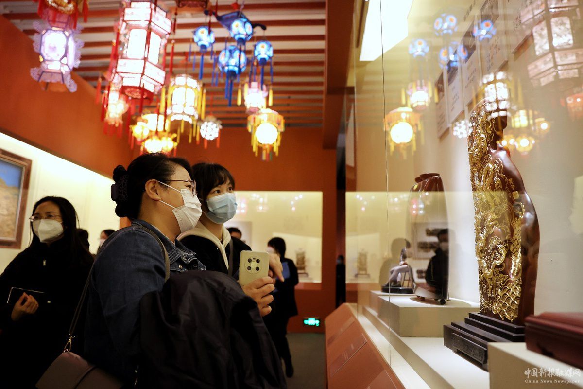 1月8日,觀眾欣賞清代金漆木雕人物龍紋桌燈。中國日?qǐng)?bào)記者 姜東 攝