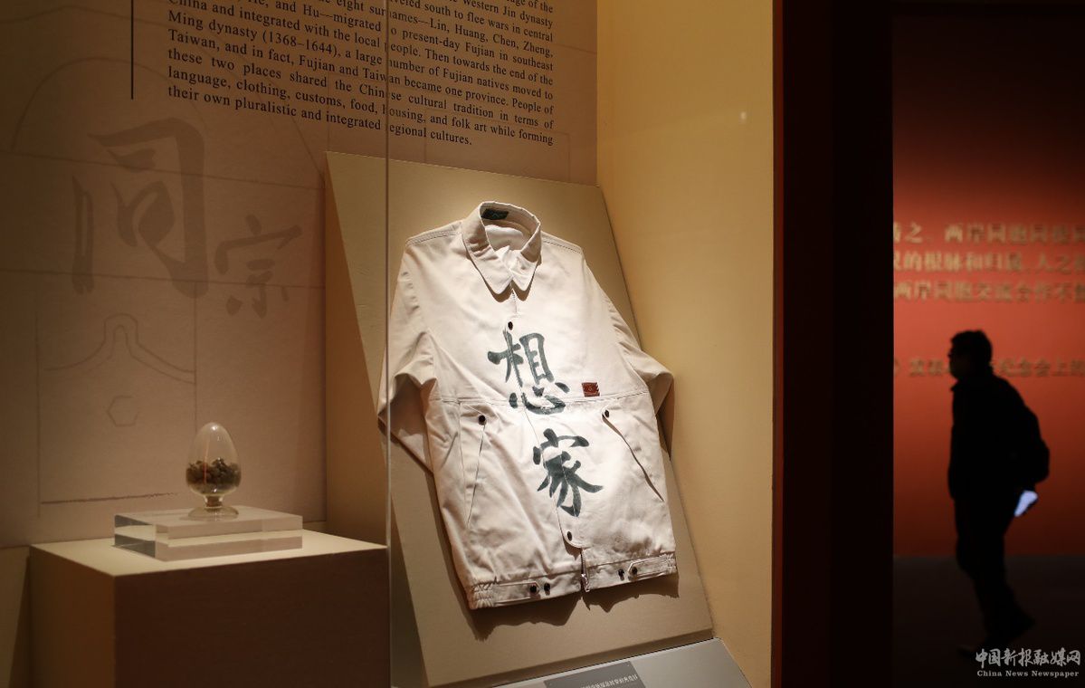 1月8日,展覽展出的1988年臺(tái)灣第一批返鄉(xiāng)探親團(tuán)帶回的泥土(左)及團(tuán)長何文德穿的“想家”夾克衫。中國日?qǐng)?bào)記者 姜東 攝