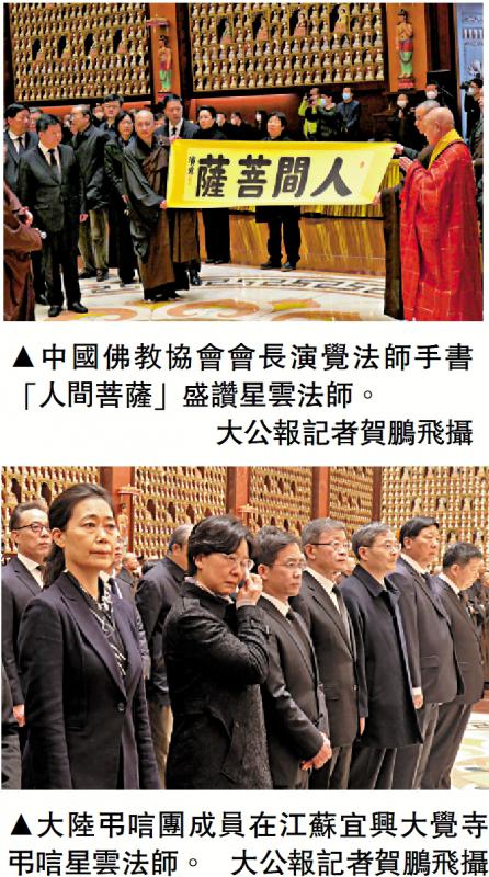 上圖:中國佛教協(xié)會會長演覺法師手書“人間菩薩”盛贊星云法師。下圖:大陸吊唁團成員在江蘇宜興大覺寺吊唁星云法師。\大公報記者賀鵬飛攝
