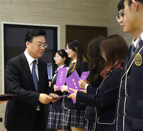中共南京市委宣傳部副部長、侵華日軍南京大屠殺遇難同胞紀念館館長周峰(左一)為出國求學前來館參加“行前一課”歷史學習的青年學生頒發(fā)“和平使者”證書。受訪者供圖