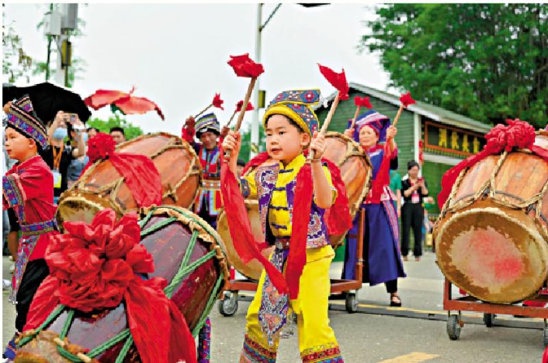 圖:2023“壯族三月三.八桂嘉年華”21日在南寧開幕。圖為馬山會鼓表演。\中新社