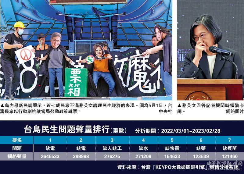 圖:(左)島內(nèi)最新民調(diào)顯示,近七成民眾不滿蔡英文處理民生經(jīng)濟(jì)的表現(xiàn)。圖為5月1日,臺灣民眾以行動劇抗議當(dāng)局勞動政策跳票。\中央社  圖:(右)蔡英文回答記者提問時頻繁卡詞。\網(wǎng)絡(luò)圖片