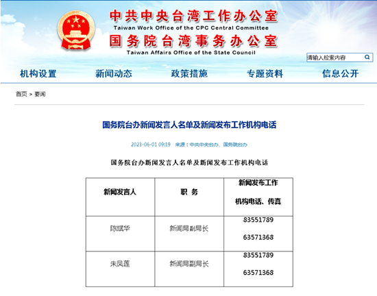 今日(6月1日),國臺辦網(wǎng)站更新顯示,陳斌華已任國臺辦新聞局副局長、發(fā)言人。目前國臺辦共有兩名新聞發(fā)言人,分別是陳斌華和朱鳳蓮,兩人均為國臺辦新聞局副局長。