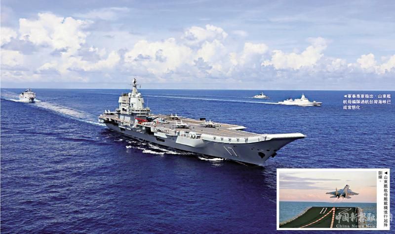 圖:(大)軍事專家指出,山東艦航母編隊過航臺灣海峽已成常態(tài)化。 圖:(細(xì))山東艦航母艦載機進行起降訓(xùn)練。