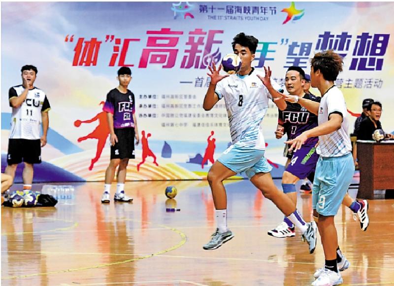 8月12日,首屆“兩岸同心 筑夢(mèng)高新”交流營(yíng)主題活動(dòng)暨“‘手’望夢(mèng)想”兩岸手球交流賽在福建福州舉行?;顒?dòng)吸引了臺(tái)灣逢甲手球俱樂(lè)部、福州第七中學(xué)手球隊(duì)、上海八九人手球俱樂(lè)部等團(tuán)體參加。圖為福州第七中學(xué)手球隊(duì)(白)與臺(tái)灣逢甲手球俱樂(lè)部隊(duì)在比賽中。 中新社