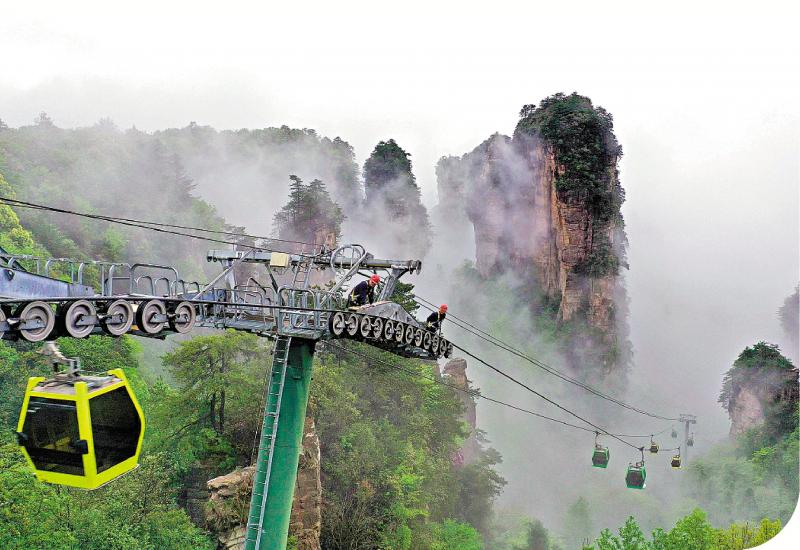 圖:張家界國家森林公園索道檢修工在巡檢設(shè)備,排除安全隱患,保障游客游覽安全。\新華社
