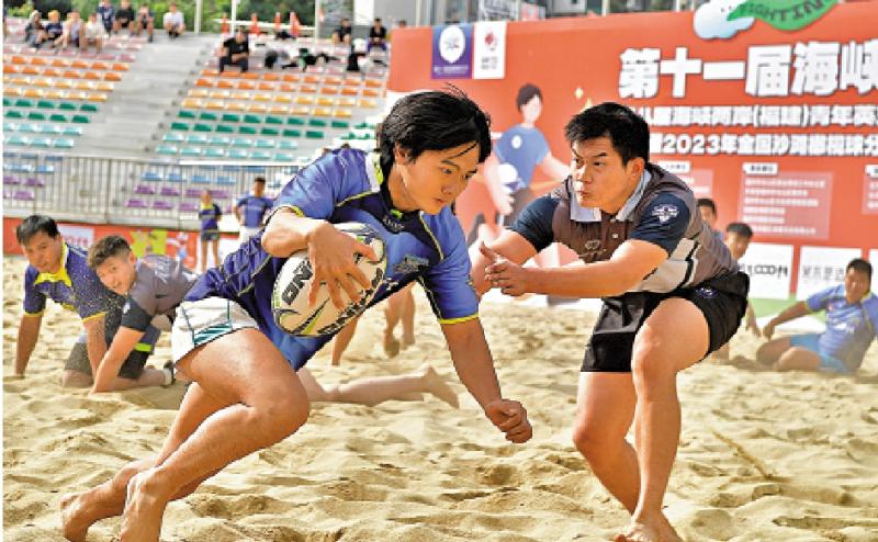 圖:12月2日,第十一屆海峽青年節(jié).第八屆海峽兩岸(福建)青年英式欖球交流賽暨2023年全國沙灘欖球分站賽(福州站)在福州市閩江公園南江濱沙灘球場舉行,來自海峽兩岸62支隊伍的近700名運動員同場競技。這是兩岸欖球交流賽史上參與人數(shù)規(guī)模最多的一屆賽事。\中新社