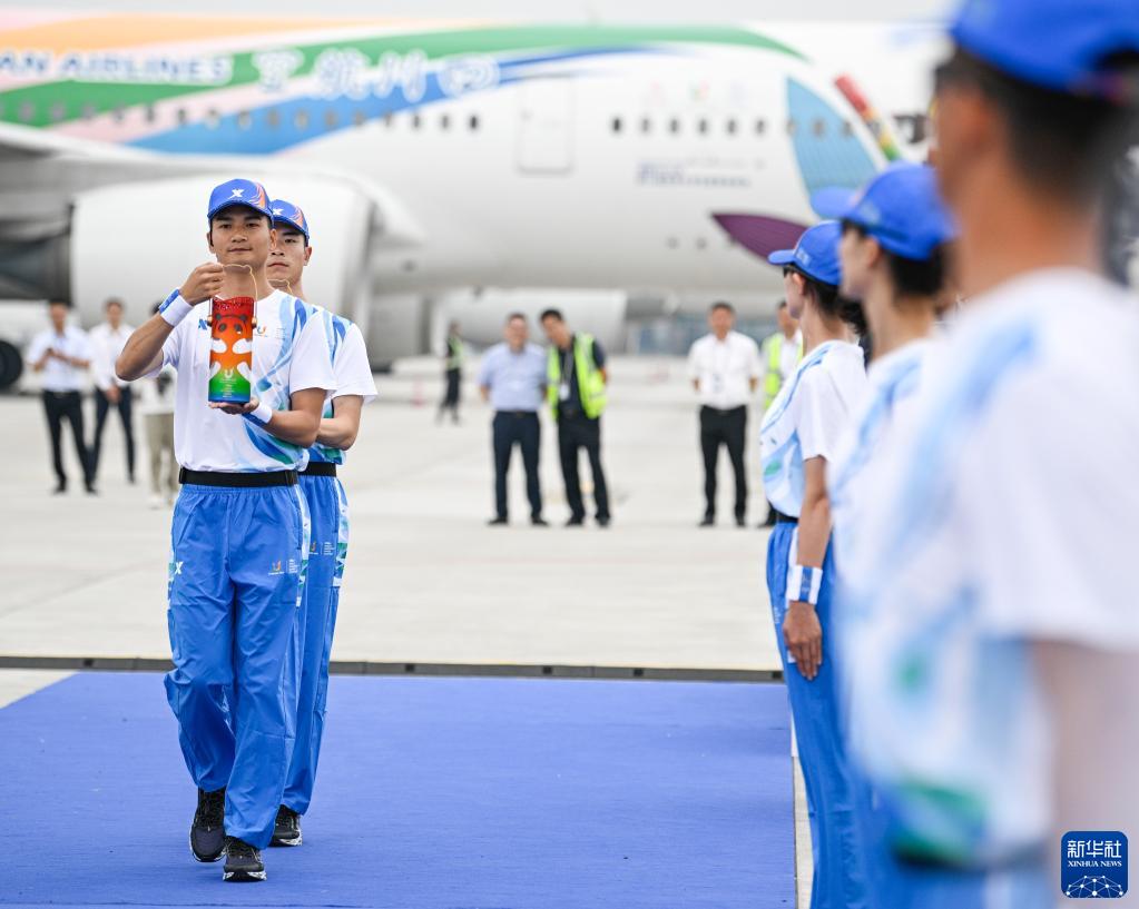 6月8日,在成都天府國(guó)際機(jī)場(chǎng),護(hù)衛(wèi)隊(duì)隊(duì)員登機(jī)前展示成都大運(yùn)會(huì)火種燈。新華社記者 王曦 攝