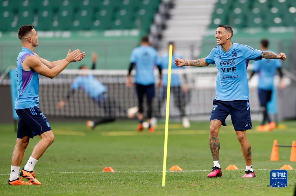 6月14日,阿根廷隊球員迪瑪利亞(右)在訓練中。新華社記者 張晨 攝