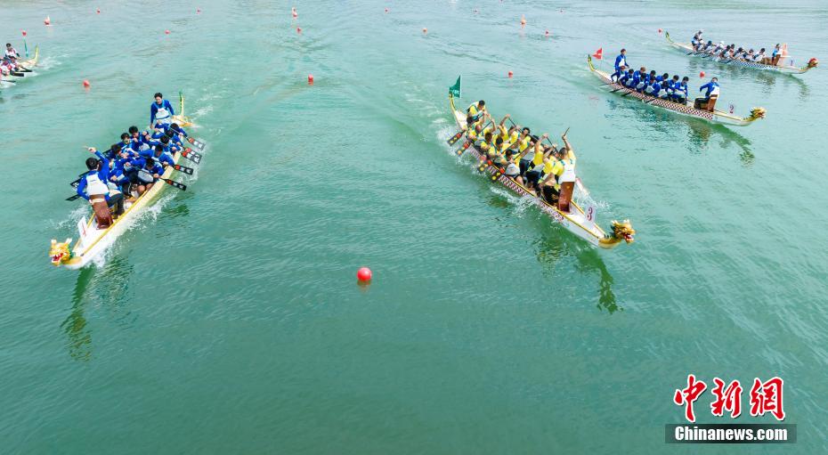 龍舟在清澈的江面劃出一道道美麗的波痕。